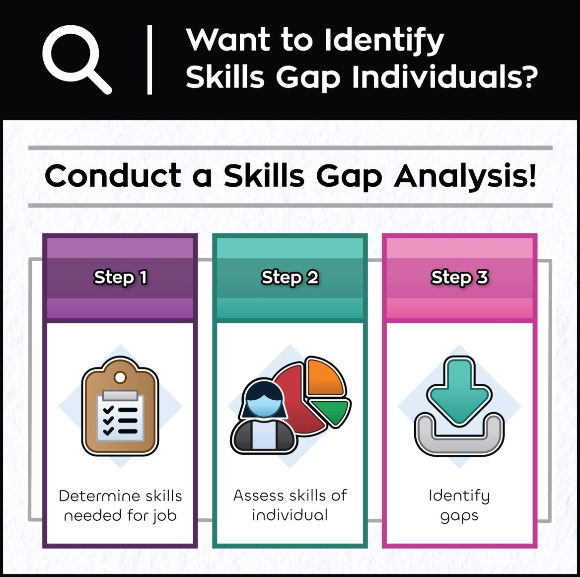 Conducting a skill gap analysis unfolds in three strategic steps: defining the desired skills, assessing the current skills of individuals, and pinpointing the gaps that exist. The illustration below provides a visual guide to this structured process.
