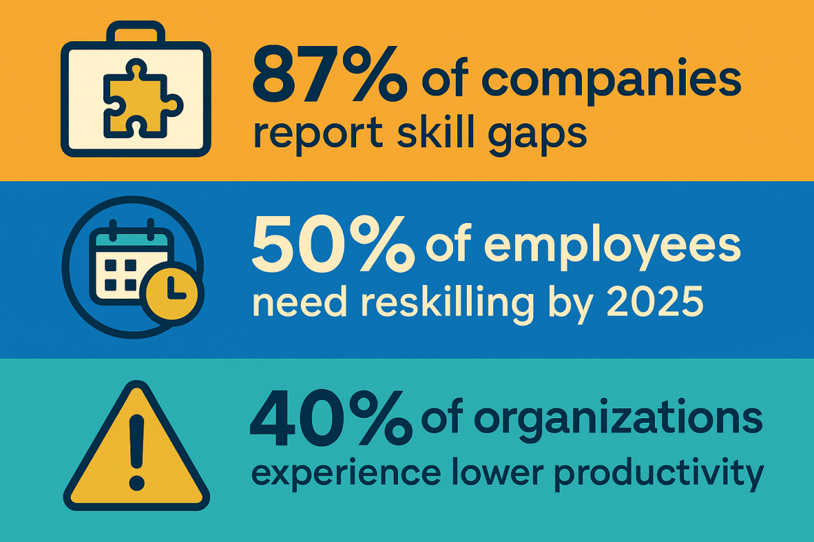 According to McKinsey, 87% of companies worldwide report current or expected skill gaps, and 40% of organizations experience lower productivity due to these gaps. The World Economic Forum also estimates that 50% of all employees will need reskilling by 2025 to keep pace with technological advancements.