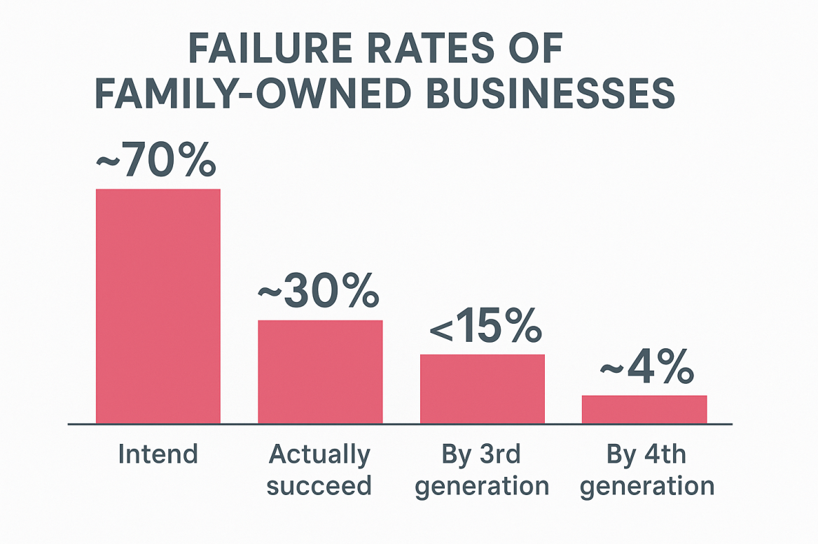 “When it comes to family-owned businesses, the numbers underscore how critical succession planning truly is. According to recent research, although some 70% of family enterprises intend to hand the business to the next generation, only about 30% actually succeed at doing so. By the third generation, the survival rate drops further — less than 15% — and when you reach a fourth-generation transition, the odds shrink to around 4%.