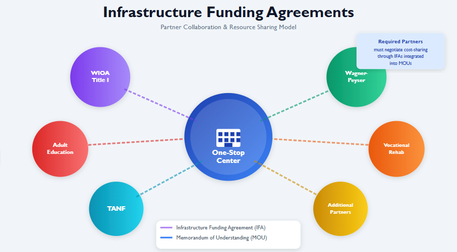 Certification is inextricably linked to infrastructure funding. WIOA explicitly mandates that local boards negotiate and enter into Infrastructure Funding Agreements (IFAs) with all required partners to share American Job Center infrastructure costs. These agreements must be integrated into Memoranda of Understanding (MOUs) with partners, regardless of whether partners are physically co-located. Research shows that despite initial concerns, co-location patterns have remained relatively stable under WIOA's cost-sharing requirements.