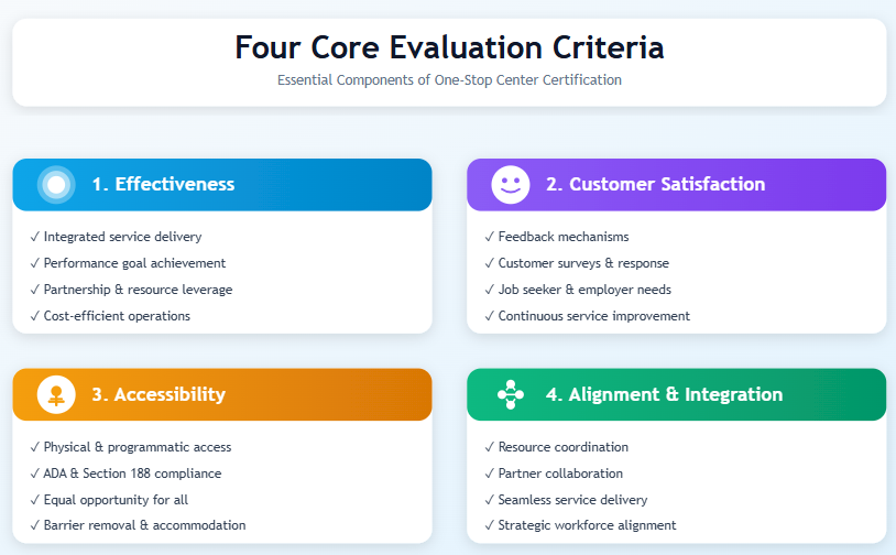 State Workforce Development Boards provide comprehensive criteria to help local WDBs evaluate One-Stop centers across four key dimensions: effectiveness, customer satisfaction, physical and programmatic accessibility, and alignment and integration of resources for continuous improvement.
